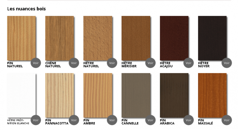 - L'esthétique et la chaleur du bois ; des essences nobles : le Pin, le Chêne, le Hêtre, en finition colorée en sélection dans une large palette, ou incolore